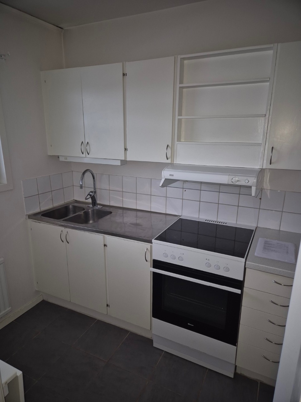 Stort rum med sovalkov, mindre kök och badrum.